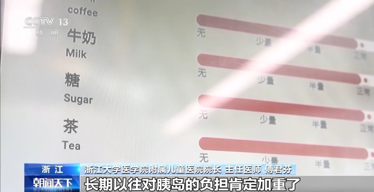 北京大学第三医院内分泌科临床营养科副主任医师 王琛:从中国居民膳食指南来说,一天的添加糖建议不超过50克,最好少于25克,但常常一杯奶茶里就加了超过25克的糖。