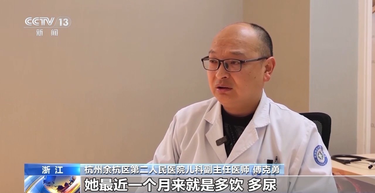 杭州余杭区第二人民医院儿科副主任医师 傅克勇:她家属告诉我们她最近一个月来就是多饮、多尿,我们怀疑有糖尿病可能。当时测的血糖是31.68mmol/L(毫摩尔每升),正常的随机血糖不能超过11.1mmol/L(毫摩尔每升)。